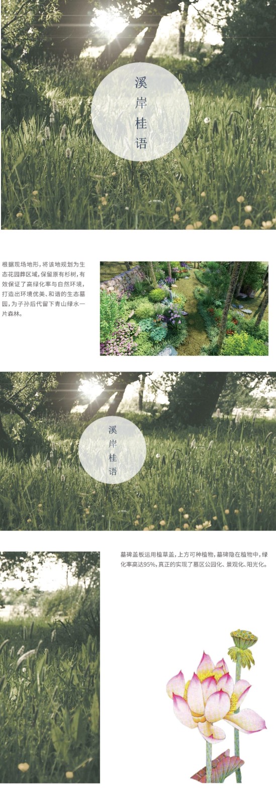墓碑盖板运用植草盖,上方可种植物,墓碑隐在植物中,绿化率高达95%,真正的实现了墓区公园化、 景观化、阳光化。