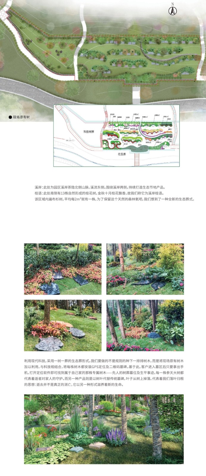 利用现代科技,采用一树一葬的生态葬形式。我们要做的不是规则的种下一排排树木,而是将现场原有树木加以利用,与科技相结合,将每株树木都安装GPS定位及二维码墓碑。基于此,客户进入墓区后只要拿出手机,打开定位软件即可找到属于自己家的那株专属树木——先人的树葬墓位及生平事迹。每一株参天大树都代表着逝者对家人的守护。而另一种产品则是以树叶代替传统墓碑,叶子从树上掉落,代表着我们落叶归根的思想:逝去并不是真正的消亡,它以另一种形式滋养着新的生命。