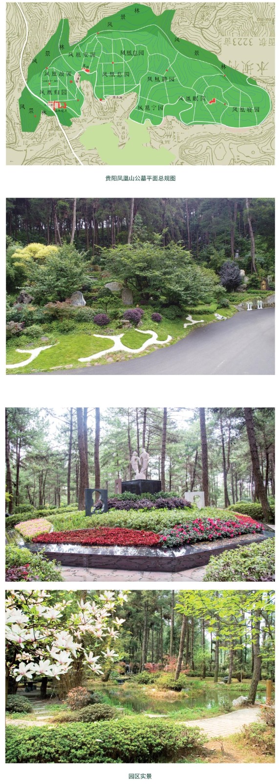 贵阳凤凰山公墓坐落于贵阳市环城林带,投资兴建于1996年,占地820余亩。该环城林带最初形成于上世纪50年代,原有林木树种单一,长势不佳,林相单调,以人工种植的马尾松和杉树为主,下层是一些野生杂灌及地被。自建园之初,凤凰山公墓充分运用林下空地,基于“化黑白为彩色、借风水成风景、变幽冥为幽居、建公墓成公园”四大建园理念,以“建设生态化、葬式生态化、行为生态化”三个层面,从保护森林生态的角度开辟墓园,科学规划,适度开发,合理利用,注重管理,打造出一座生态绿色的公墓来。经过二十余年的实践,该实例为林下与公墓的复合利用探索了一条可行之路。